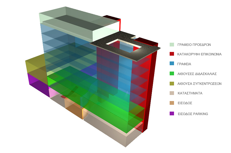 Ipirotiki Software & Publications is a company that controls the production of software and trade media which address accountants, tax data and trading, as well as sees itself as a major player in the area of specialized education in related areas. It controls a network of specialized ‘node-spaces’ that function as internet cafes and information dissemination spaces and social meeting points for professionals in the above areas. The new headquarters (Lenorman avenue) in Athens includes shops at ground level, educational facilities and a multi-use 256 people capacity conference center on the first floor, five typical office space floors, president’s office with conference rooms, secretary and a swimming pool on the 6th floor. The building faces the Greek Parliament index building.