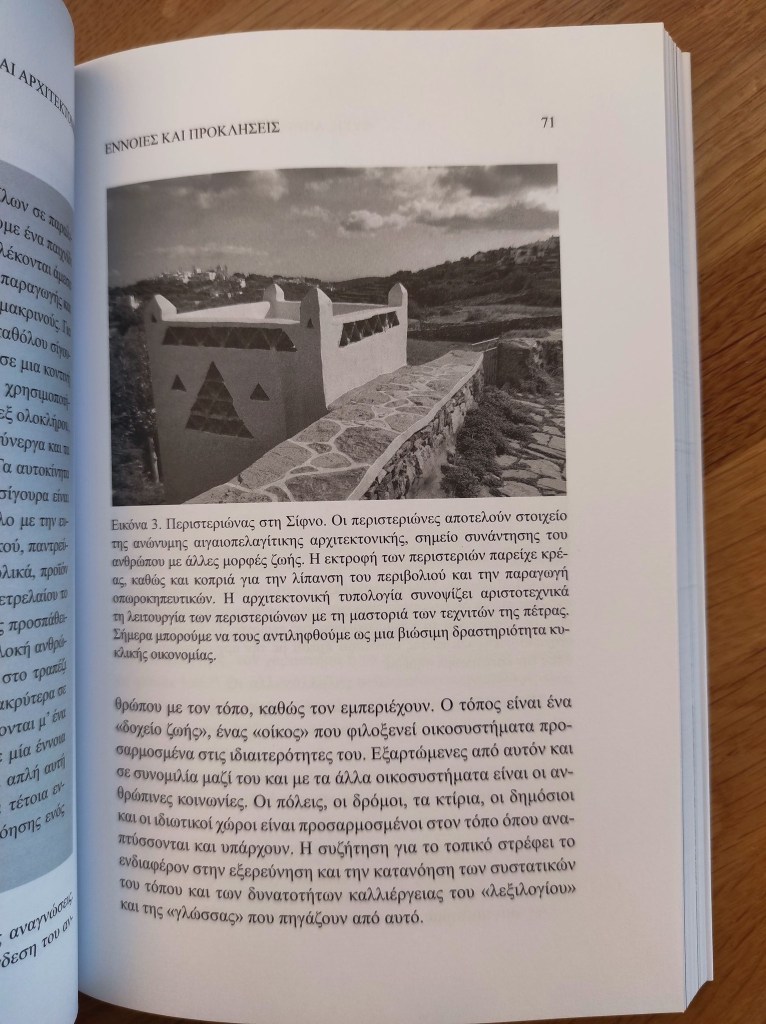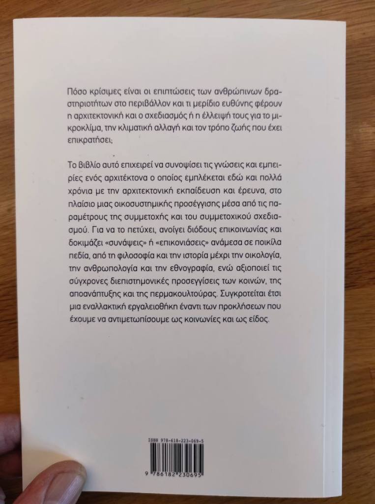 Στο βιβλίο αυτό συζητούνται παράλληλα, αν όχι επί ίσοις όροις, η φύση, η κοινωνία και η αρχιτεκτονική. Πρόκειται για ένα ρηξικέλευθο εγχείρημα, καθώς μπορώ μεν να μιλήσω ως μέλος του ανθρώπινου είδους, της ελληνικής κοινωνίας και ποικίλων τοπικών και διεθνικών κοινοτήτων, όπως επίσης του αρχιτεκτονικού κλάδου, αλλά με τι διαπιστευτήρια μπορώ να μιλήσω για τη φύση; Παρά την αγάπη μου γι’ αυτήν από τότε που θυμάμαι τον εαυτό μου, και την περιέργειά μου να την εξερευνήσω όπου μπορούσα, στις κορυφές των βουνών, σε θάλασσες, δάση, λίμνες και υδροβιότοπους όλων των ηπείρων, παραμένει πάντα αγαπημένη αλλά και άγνωστη, γεμάτη αστείρευτα μυστήρια. Όσο κι αν προσπαθήσει κανείς, μια τέτοια προσέγγιση παραμένει αναπόφευκτα ανθρωποκεντρική. Συνοψίσει γνώσεις κι εμπειρίες από την αρχιτεκτονική εκπαίδευση και έρευνα στο πλαίσιο μιας οικοσυστημικής αντίληψης και σε μια προοπτική συμμετοχικού σχεδιασμού μέσω «συνάψεων» ή «επικονιάσεων» ανάμεσα σε ποικίλα πεδία, από τη φιλοσοφία και την ιστορία μέχρι την οικολογία, την ανθρωπολογία και την εθνογραφία, ενώ αξιοποιούνται σύγχρονες διεπιστημονικές προσεγγίσεις όπως των κοινών, της αποανάπτυξης και της περμακουλτούρας προς την συγκρότηση μια εναλλακτικής εργαλειοθήκης έναντι των προκλήσεων που έχουμε να αντιμετωπίσουμε ως κοινωνίες και ως είδος.
