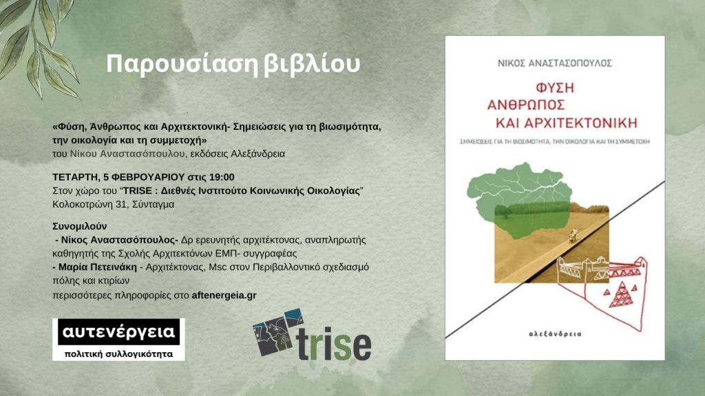 Κυκλοφορία του βιβλίου με τίτλο Φύση, Άνθρωπος & Αρχιτεκτονική: Σημειώσεις για την Βιωσιμότητα, την Οικολογία και τη Συμμετοχή